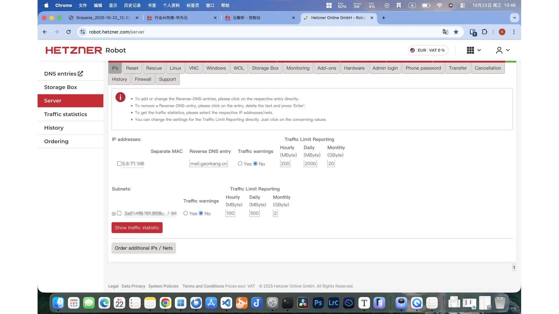 虽然 Hetzner 支持为 IPv6 地址配置 RDNS(反向解析),理论上完全可以使用 IPv6 来部署邮件服务器,但考虑到当前全球范围内 IPv6 的实际普及程度,最终还是选择以 IPv4 来部署邮局服务器。