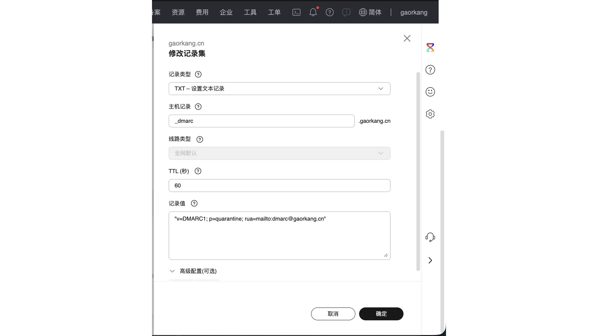 "v=DMARC1; p=quarantine; rua=mailto:dmarc@gaorkang.cn"