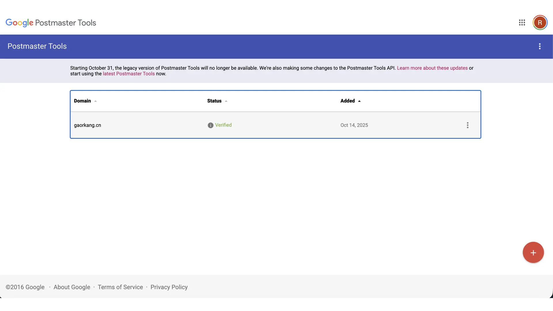 根据 iRedMail 文档,这是可选的但是强烈建议,操作很简单,在Google Postmaster Tools 网站,添加下邮件域名就好。