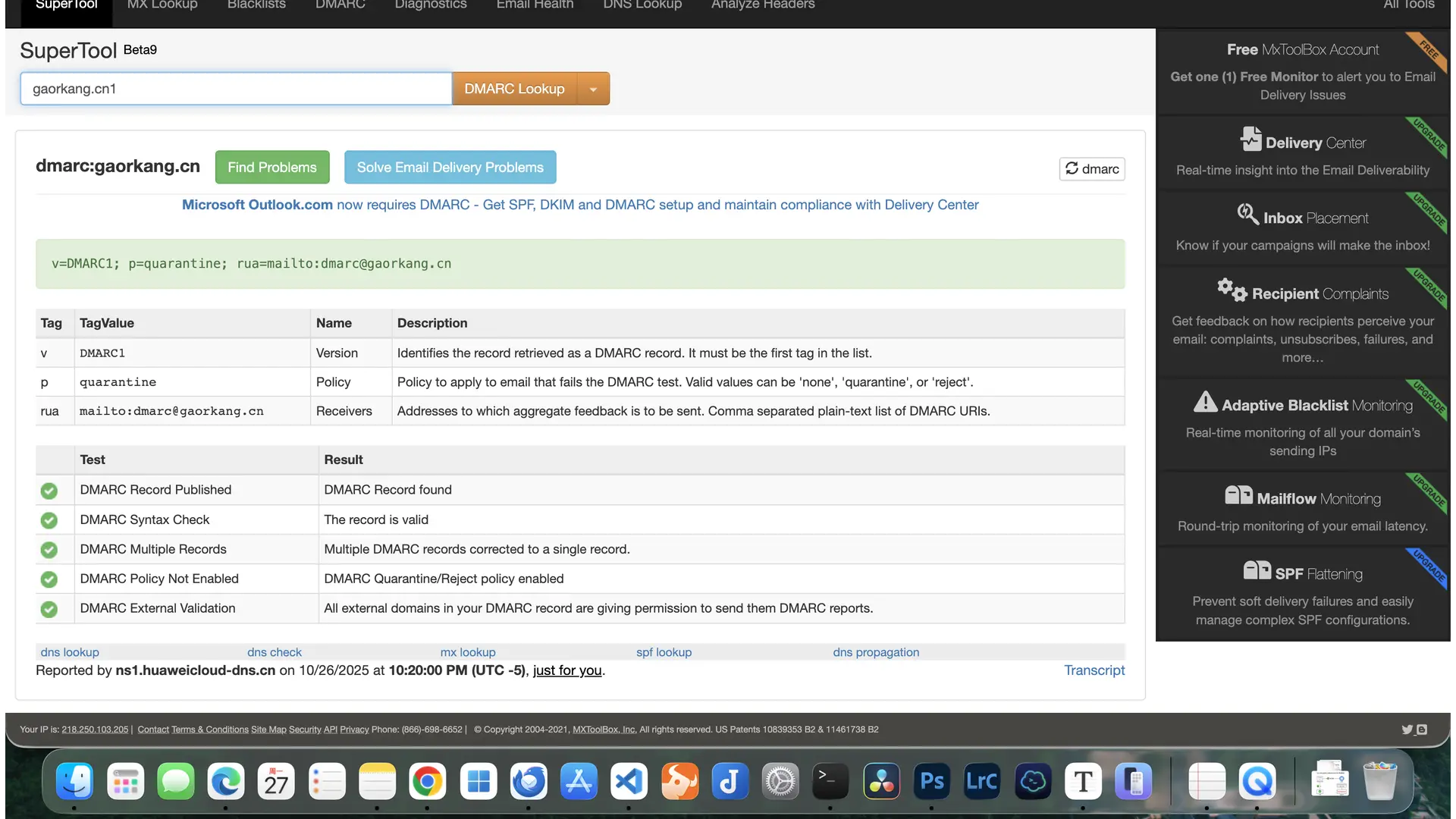 可以通过访问 MXToolbox SuperTool 网站,输入自己的邮箱域名(例如 mail.gaorkang.cn),即可快速检测邮箱相关的 DNS 记录 是否配置正确,包括: