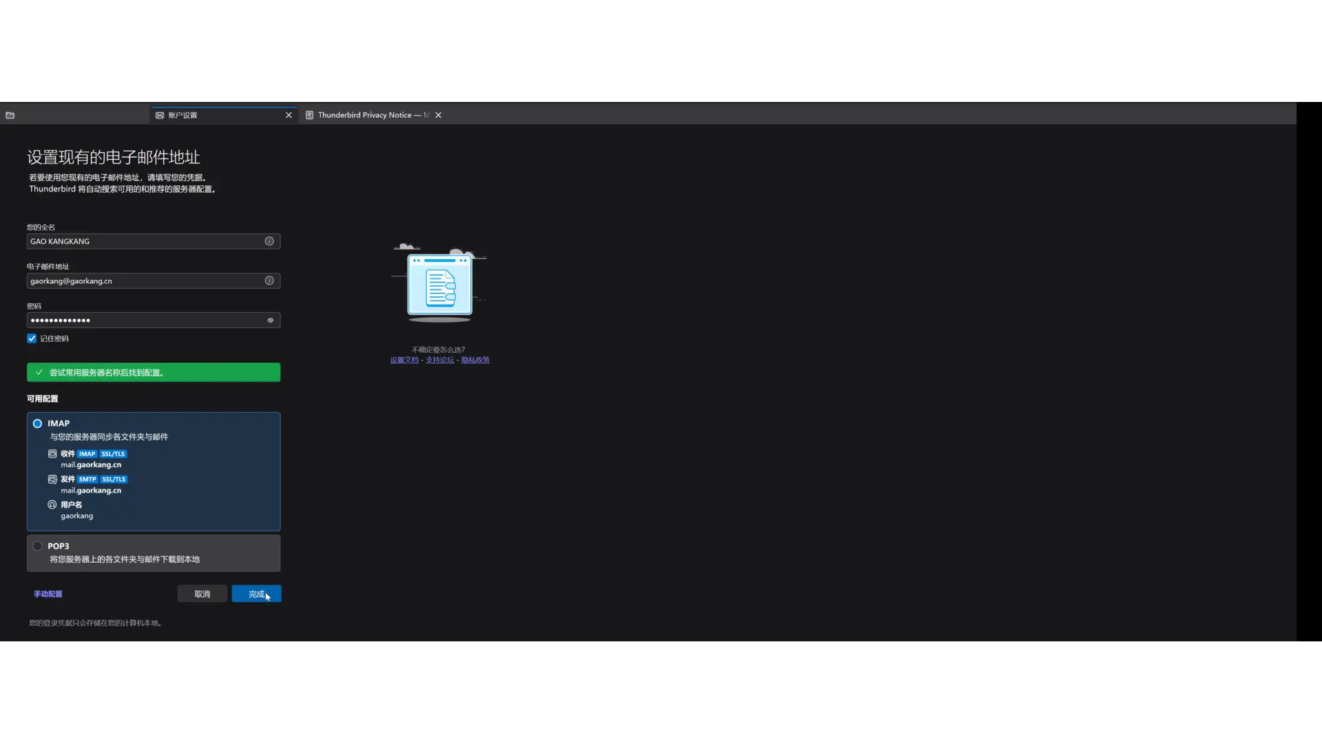 只要在域名的 DNS 中正确配置 autodiscover 记录,Thunderbird 在设置邮箱账户时就会自动检测并配置服务器参数。