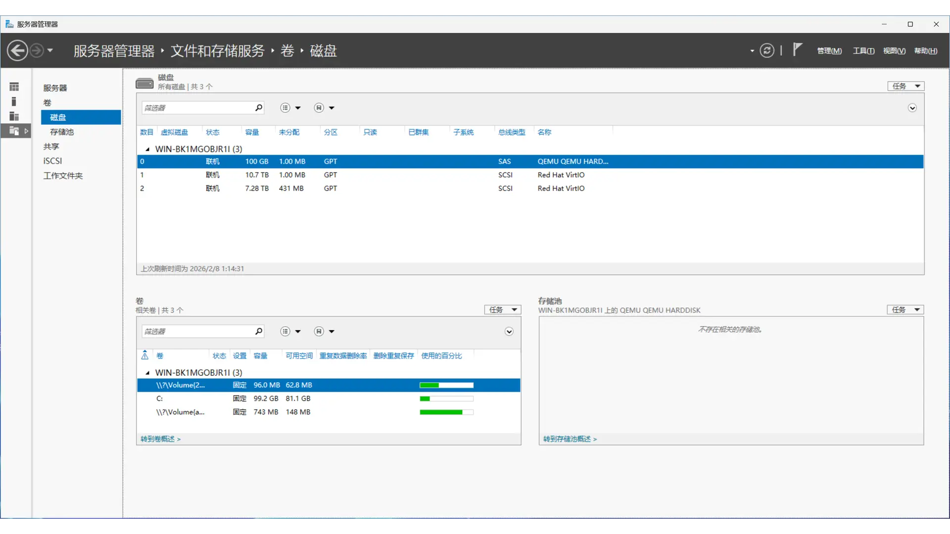 作为数据管理中心,通过 VirtIO 半虚拟化磁盘映射方式直通 LSI 阵列卡创建的虚拟磁盘,统一管理 2×4T RAID 1(数据安全)、2×4T RAID 0(性能池)和 12T JBOD 三组 SAS 存储阵列,提供 SMB 共享服务,延续原有的 NTFS 数据管理方式。