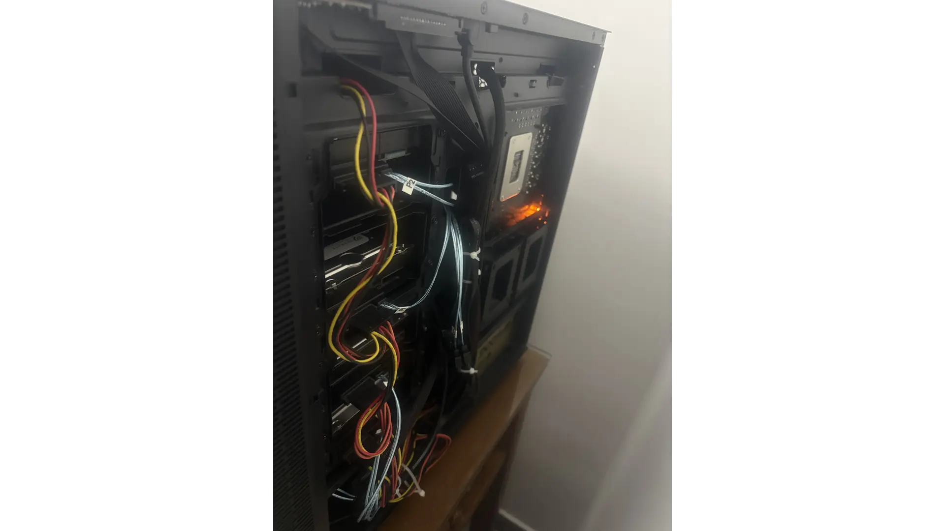 本以为更换到 Ultra 平台后,功耗可以节省一大截,毕竟使用的台积电 N3B 的工艺,但 SAS 硬盘基本无法休眠加上阵列卡也要产生额外的功耗。实际测试下来,也没省多少。在插入 5 块 SAS 硬盘 + 一块 HHHL 固态硬盘 + 一块 256G SATA 固态硬盘 + 阵列卡,同时部署 6 个虚拟机的情况下,待机功耗约 103W,在解码一个 4K 103 Mbps 码率的视频时,功耗约 114W。