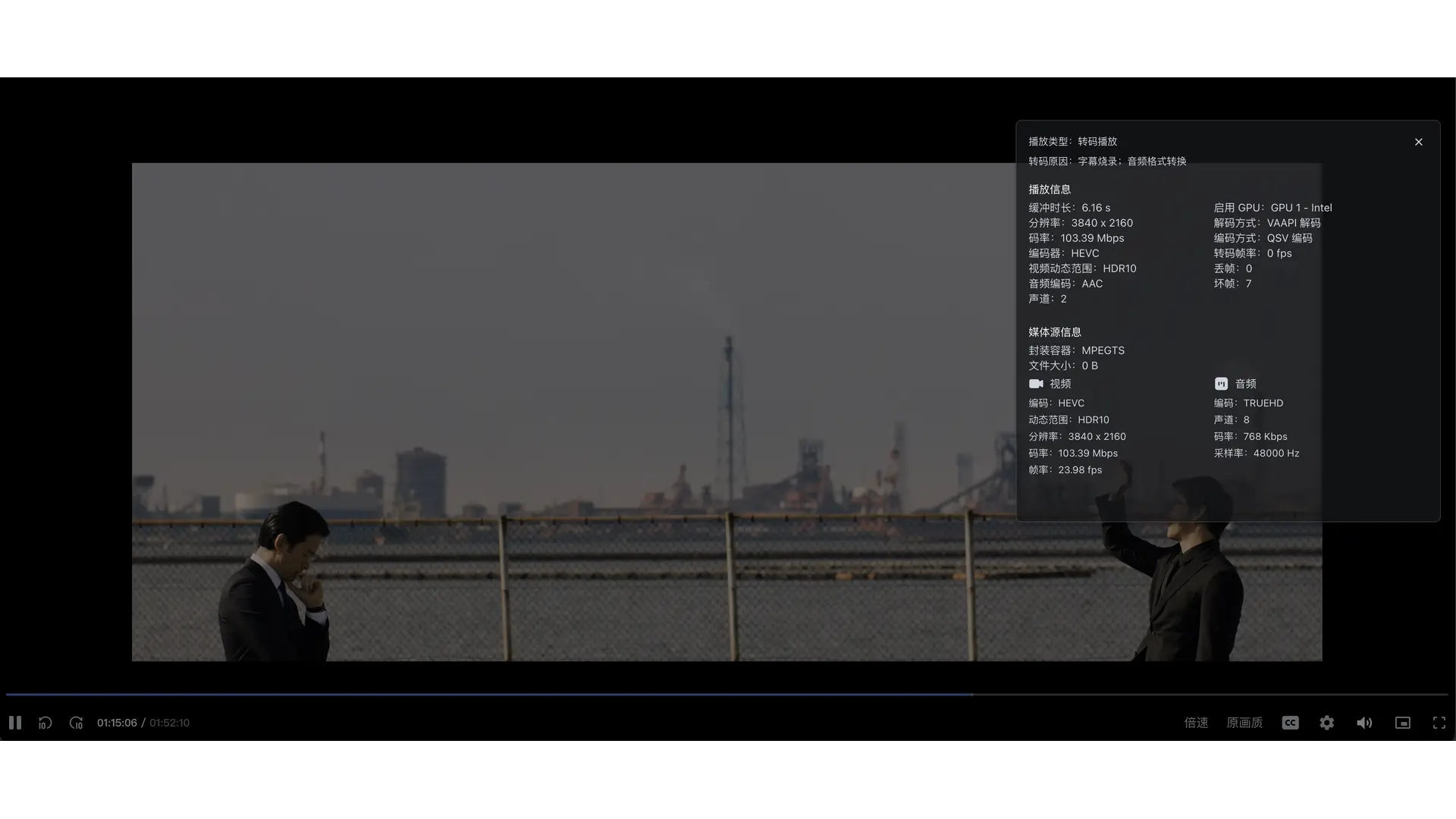 通过 SR-IOV 直通 Ultra 5 225 的 Arc 130T 核显,然后挂载 Windows 提供的 SMB 共享影视库,专注于媒体刮削、解码和相册管理。