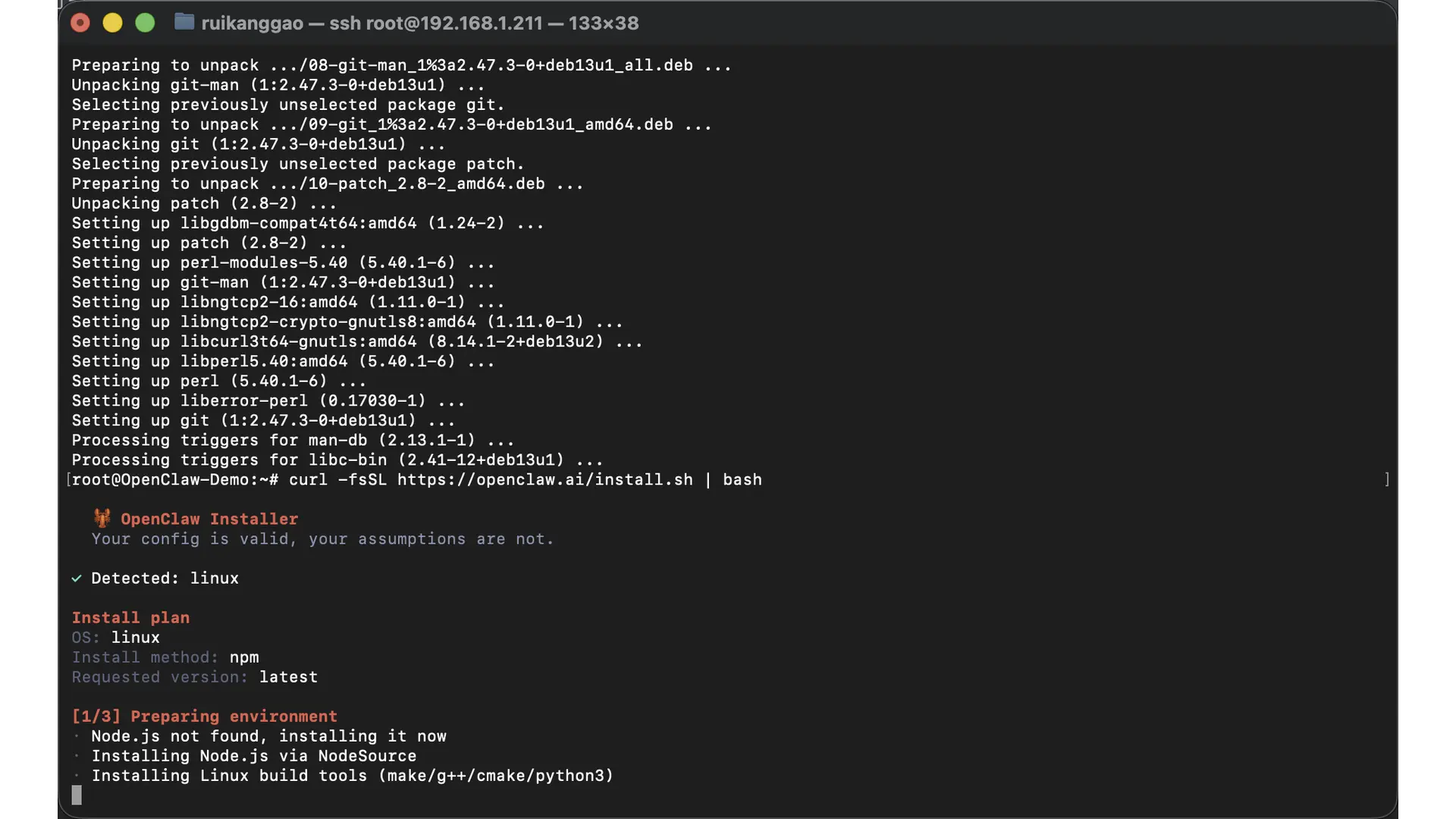 若没有自行编译需求,直接用官网的快速安装脚本自动配置就好了,它会自动安装所有 OpenClaw 所需要的依赖。