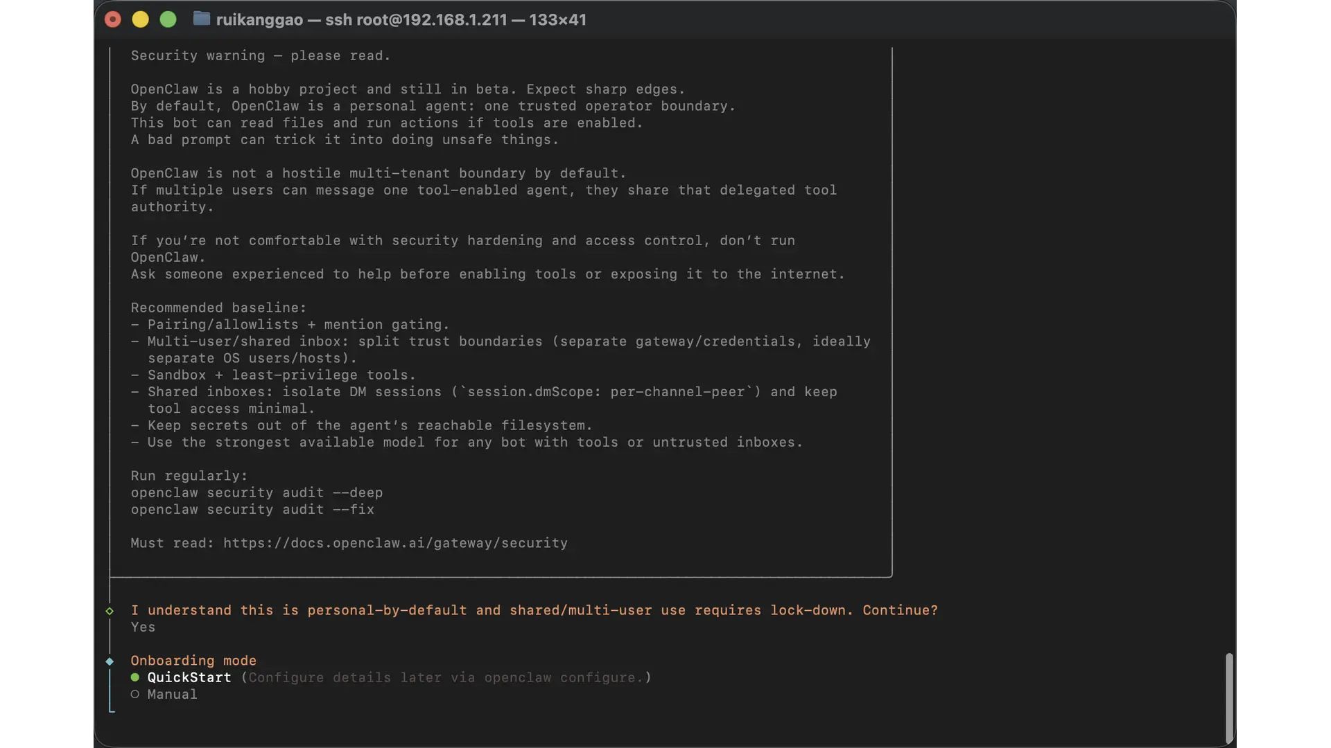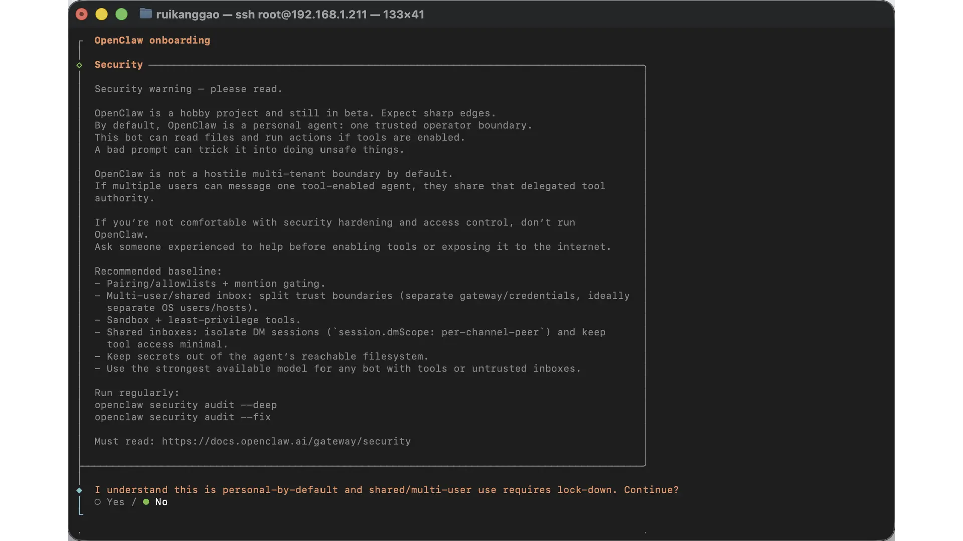 在安装完 OpenClaw 后,Shell 里会自动进入配置界面,首先就是 OpenClaw 的警告界面(免责条款),按 yes 继续:
