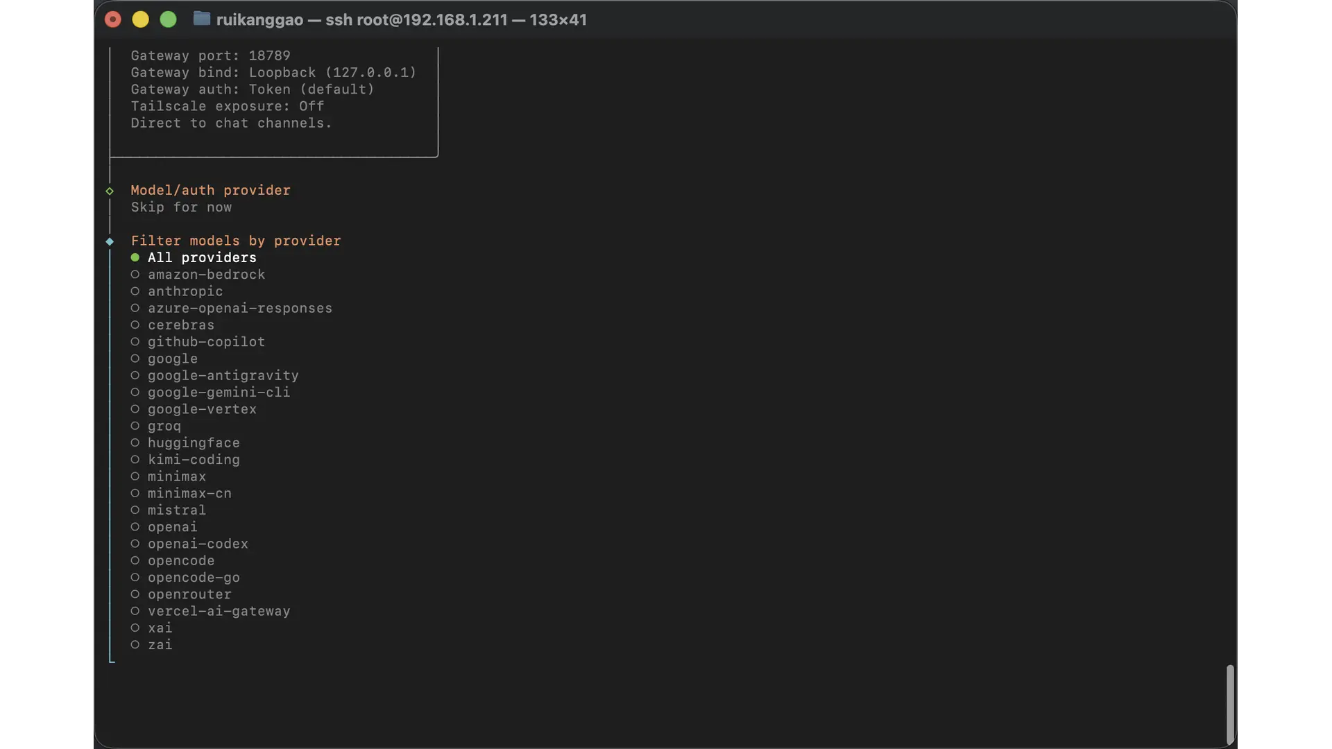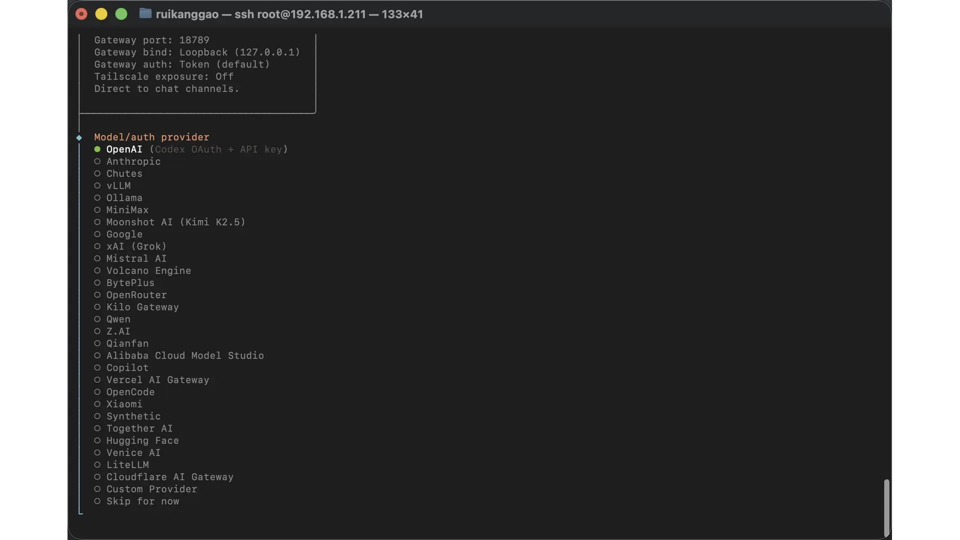 Model/auth provider 选择要接入的大模型提供商,没有的话可以选择 skip for now(跳过),等后续在后台面板配置。