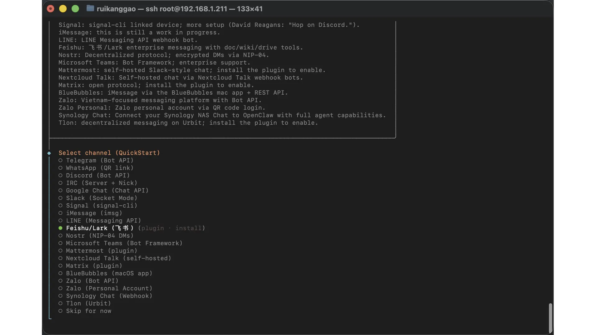 Select channel (QuickStart) 里选择要使用的信息集成 APP,官方的龙虾目前国内的社交软件只支持飞书,可以在这里选择飞书,也可以选择 skip for now 后续配置。