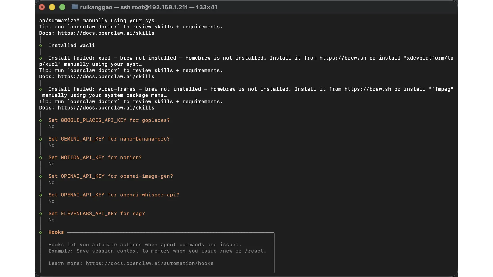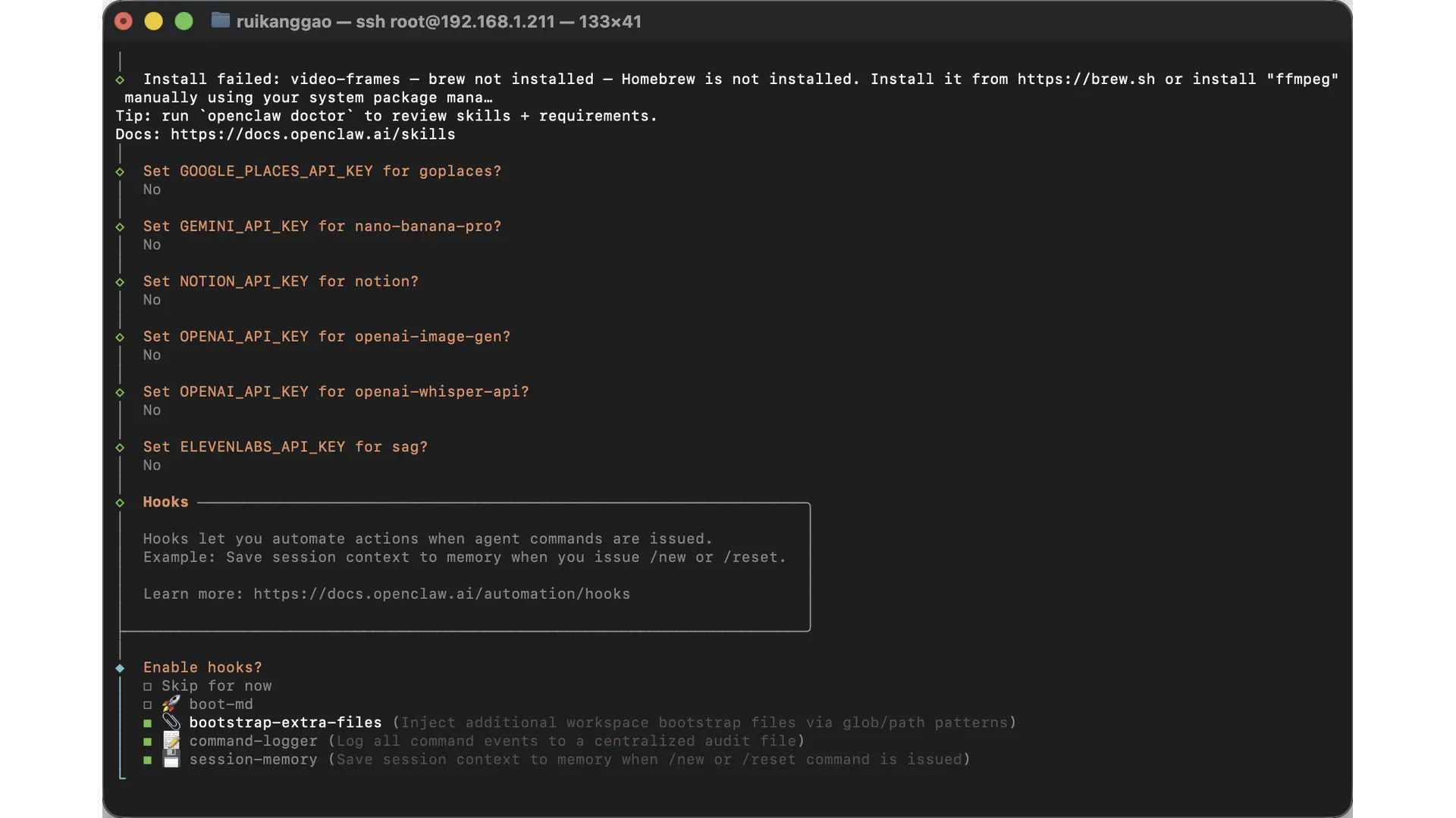 Set GOOGLE_PLACES_API_KEY for goplaces、Set GEMINI_API_KEY for nano-banana-pro、Set NOTION_API_KEY for notion、Set OPENAI_API_KEY for openai-image-gen、Set OPENAI_API_KEY for openai-whisper-api、Set ELEVENLABS_API_KEY for sag 这些国际大厂的模型 API 等,都可以选择 no 跳过。