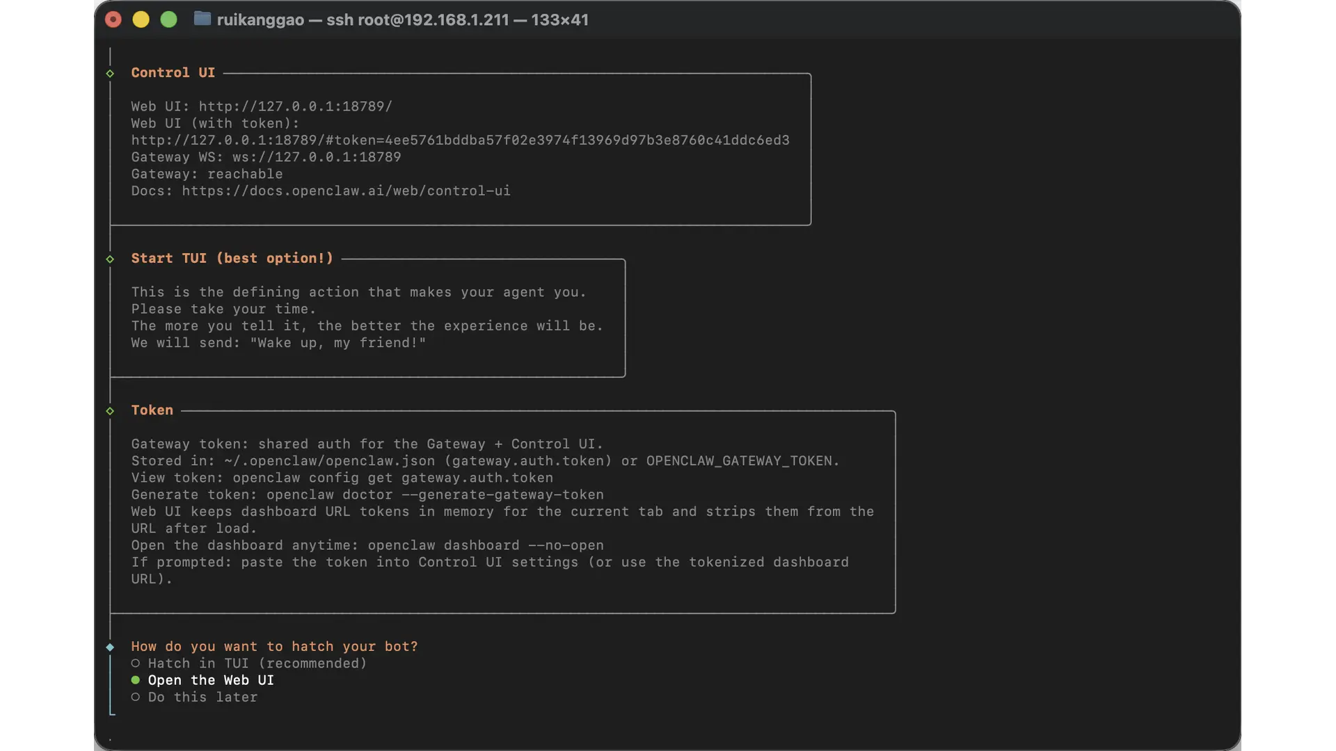 最后在选择孵化龙虾时,选择 Web UI,然后在浏览器打开龙虾面板进行后续配置。