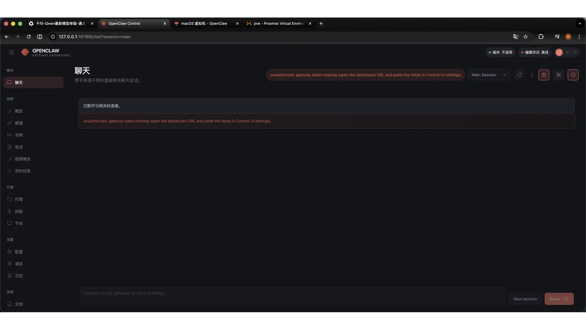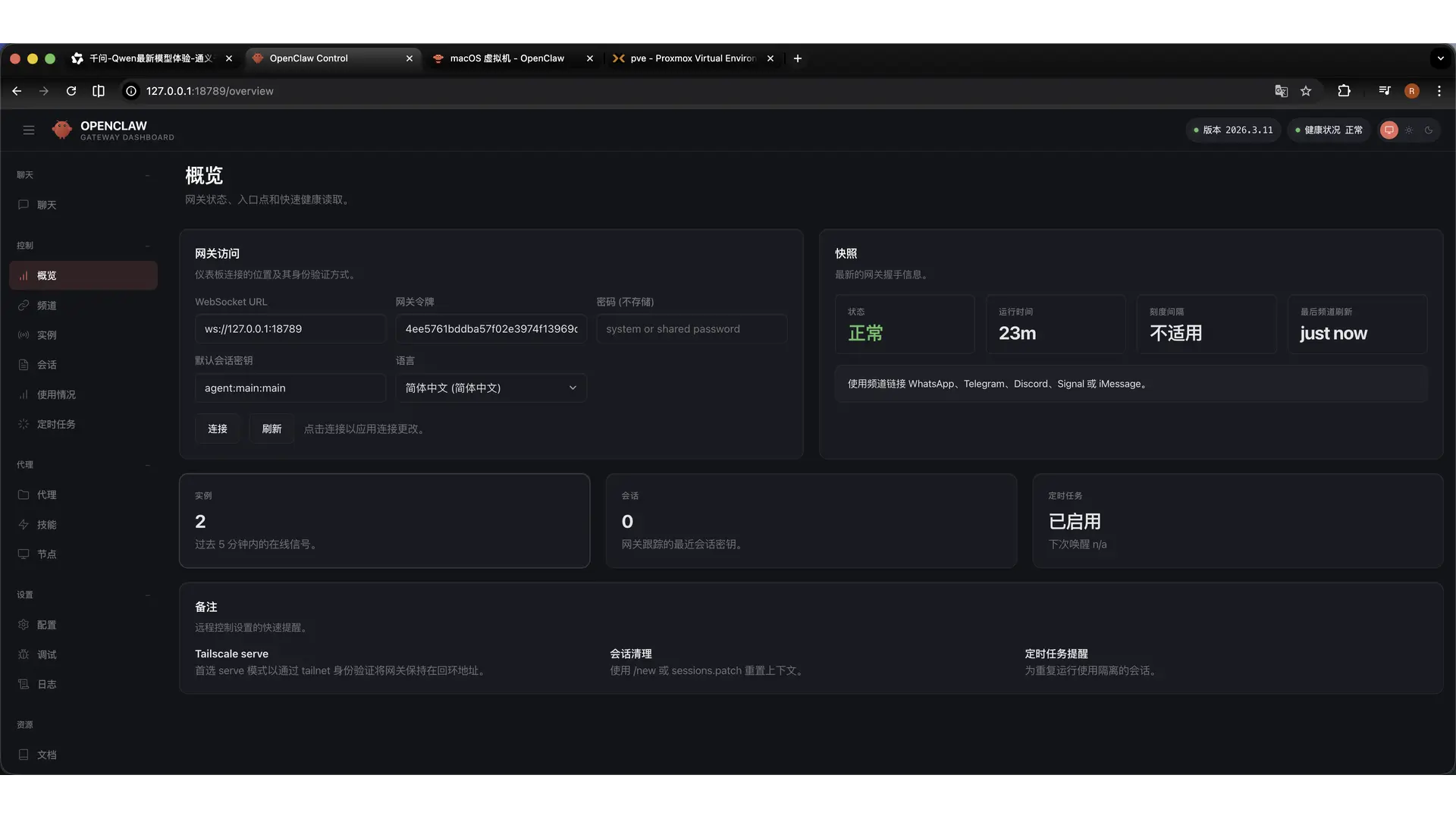 然后在浏览器输入:127.0.0.1:18789 进入后台面板,到此基本安装完成。