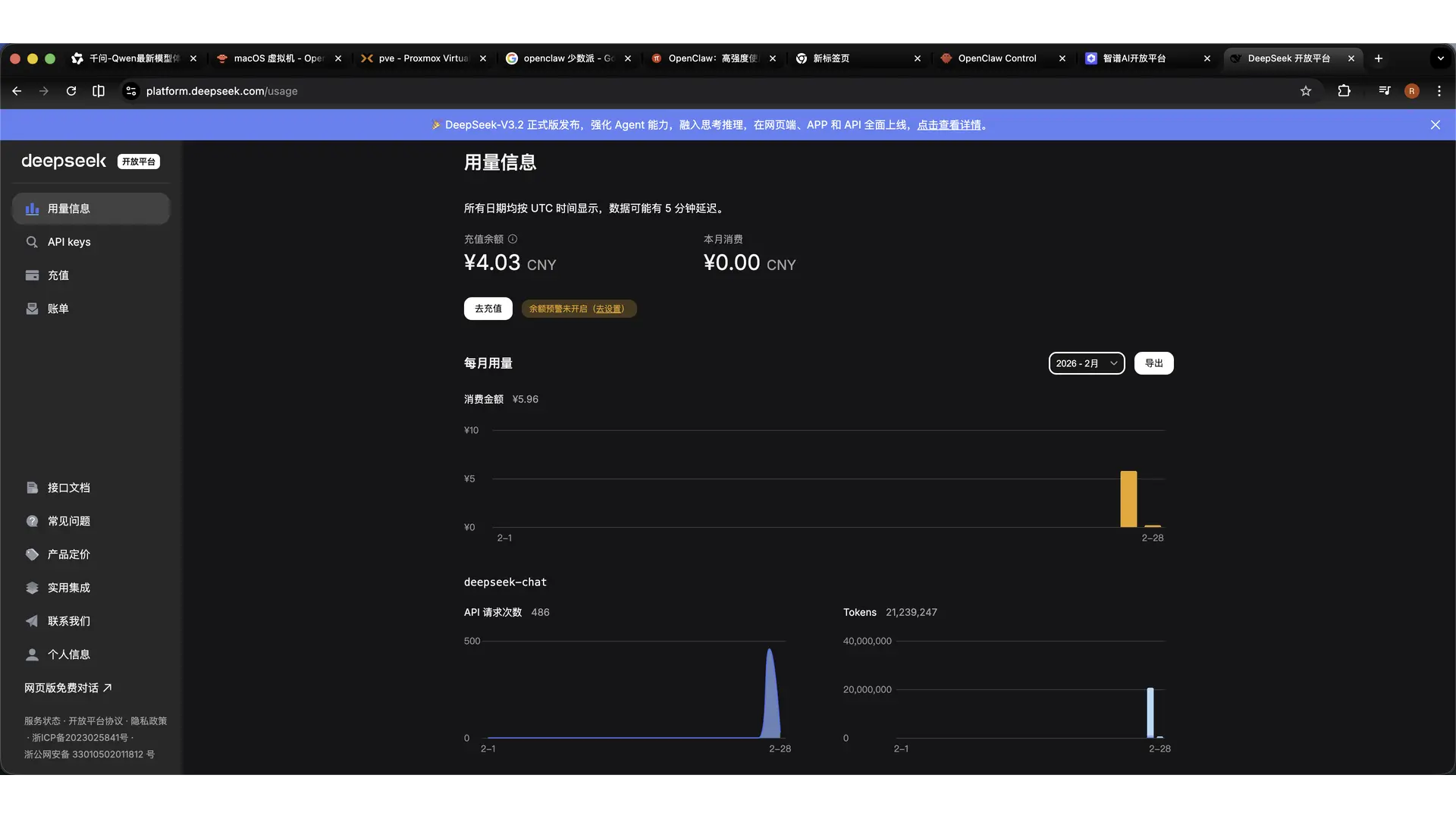 然后搜索网上看哪家 AI 可以按量计费,在 DeepSeek 充了 10 块钱尝试先,大概半天,消耗 2100 万 tokens,花费 5.96 元。