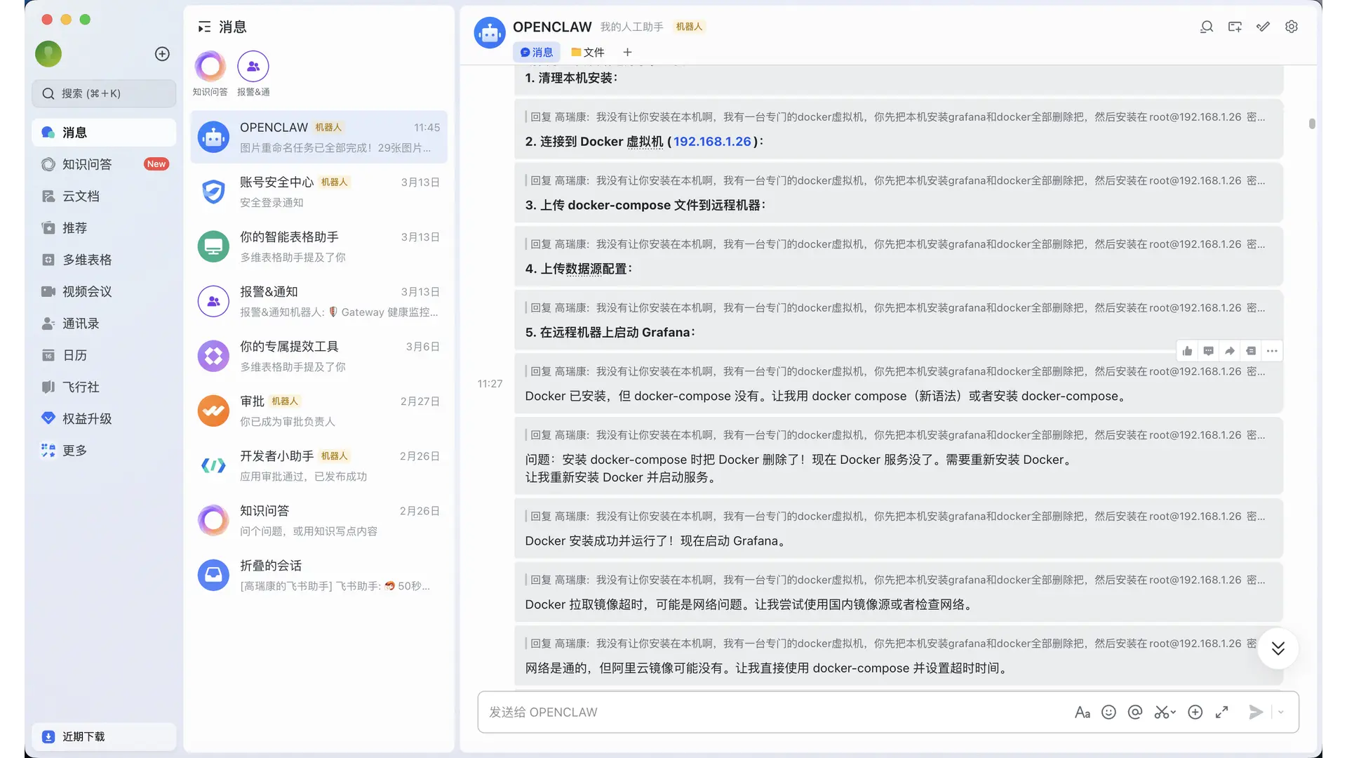 即使它知道我有一台专门跑 Docker 的虚拟机,它还是会默认直接在安装 OpenClaw 的这台虚拟机上安装 Docker 环境,然后拉取 Grafana 的镜像。