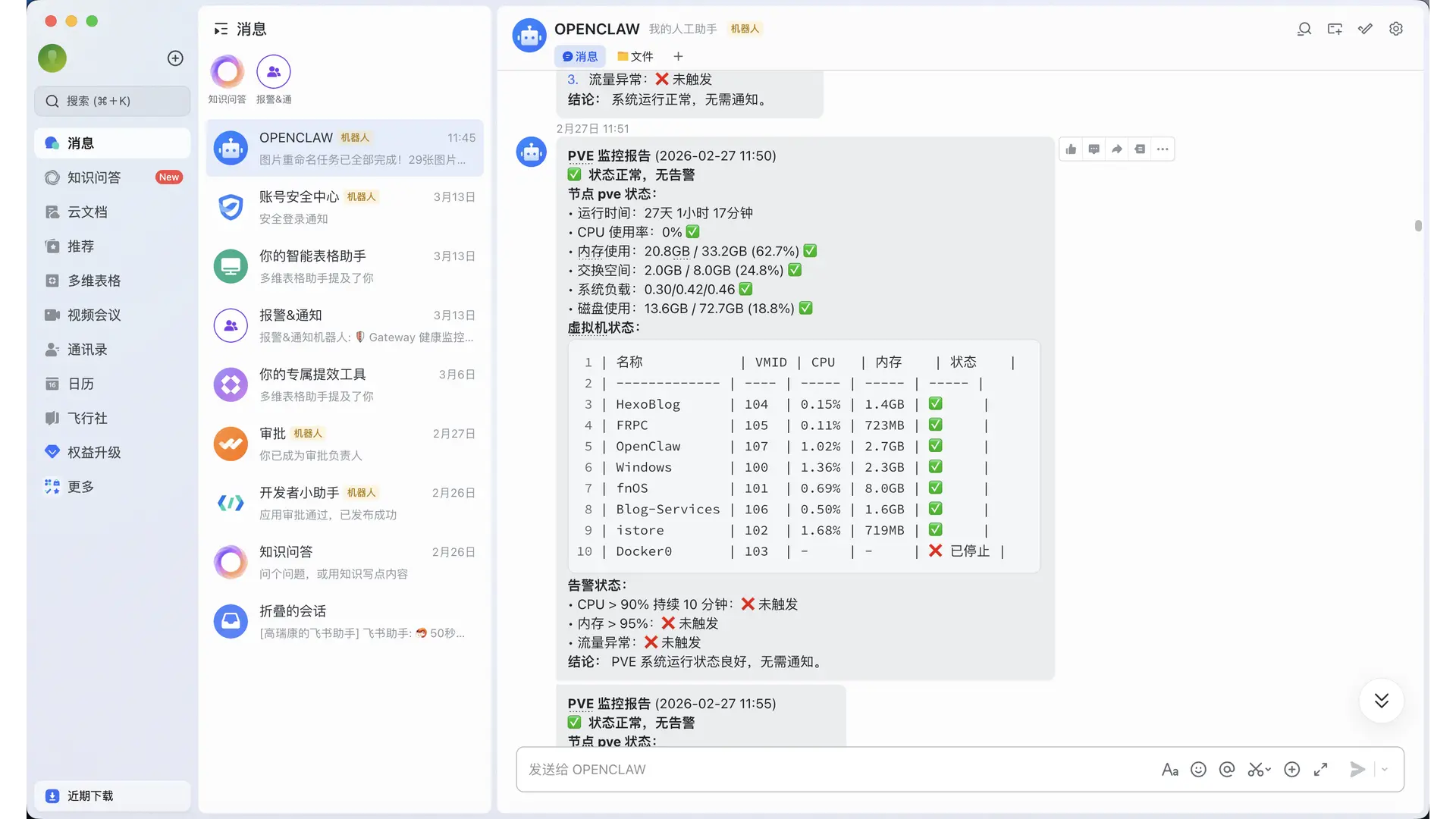 目前虚拟机跑 OpenClaw,确实给家庭 All in One 服务器运维提升极大的效率,比如:快速部署一个 Docker 容器,快速创建一个虚拟机、时刻监控服务器状态,定时清理垃圾、日志文件、管理证书到期更新。