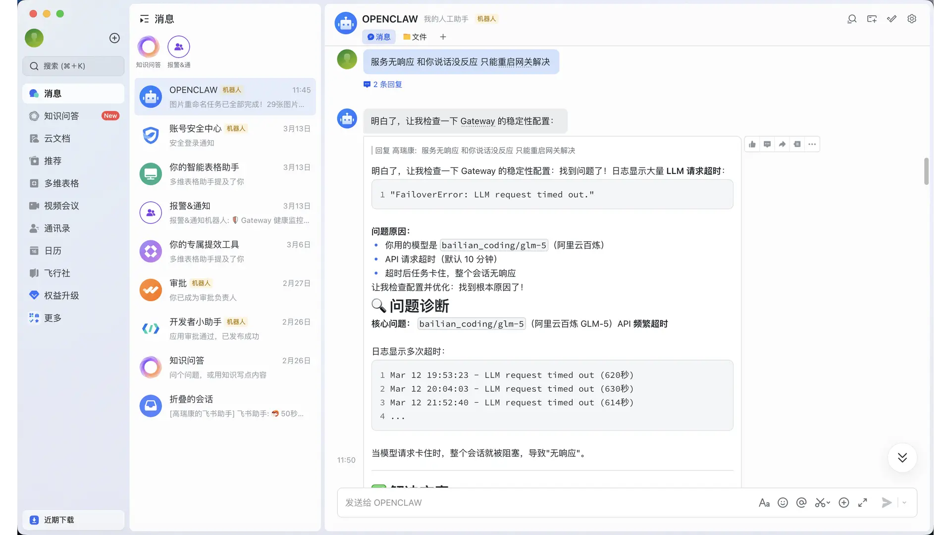 解决办法:让 OpenClaw 自己写个检测脚本,无响应超过 5 分钟自动重启网关。